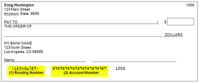 There is no fee to pay by eCheck. Before beginning, you must have the Management Company ID (8086), Association ID (MUIR) and your lot number, which is on your statement. You must also have your checking account information: (1) Routing number and (2) Account number. Do not include the check number as part of the account number. See image below.
