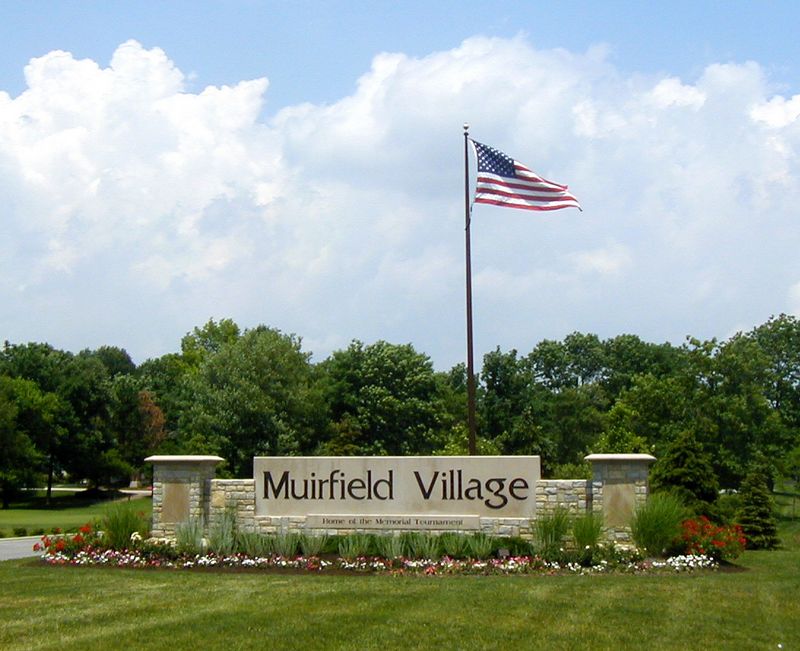 The entrance sign at the south end of Muirfield Village welcomes all who live here, visit, or just pass through.