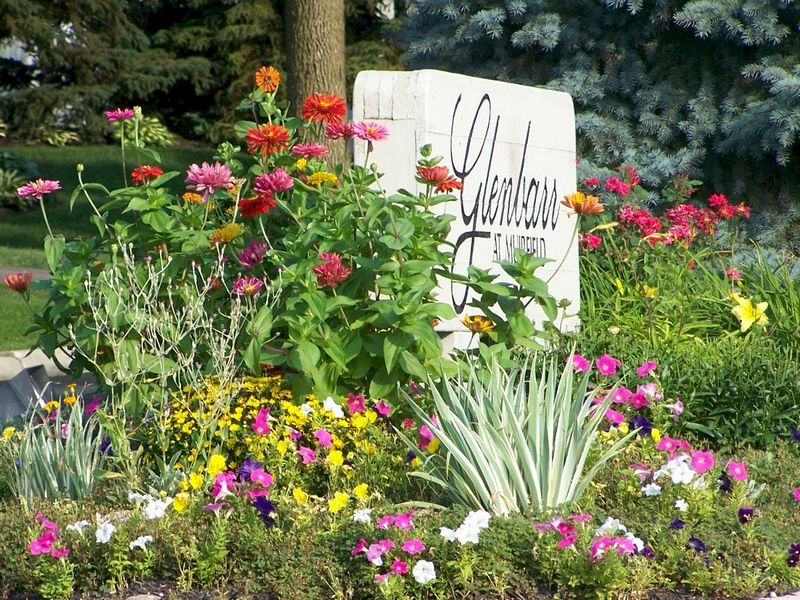 The beautifully landscaped entrance to the Glenbarr subdivision at Muirfield.