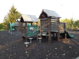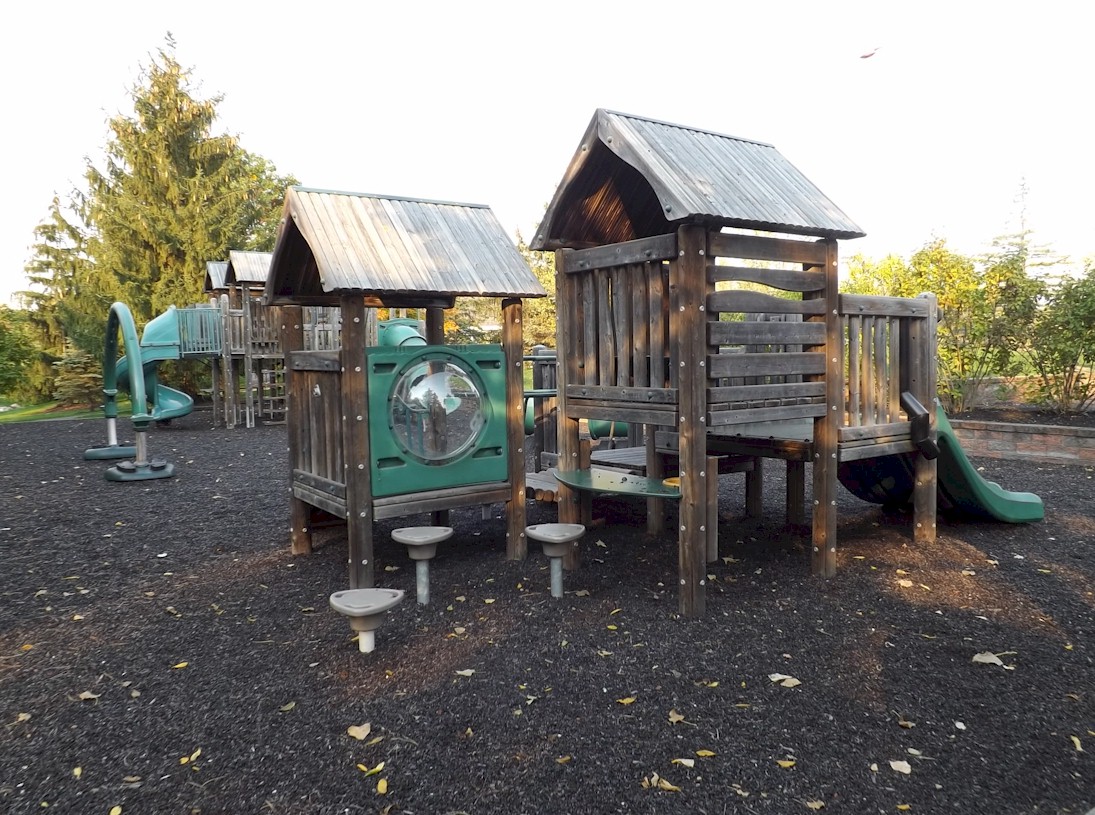 The age-specific play equipment, designed for 2-5 year olds and 5-12 year olds, sit on mulched rubberized surfaces adjacent to the fenced pool areas.